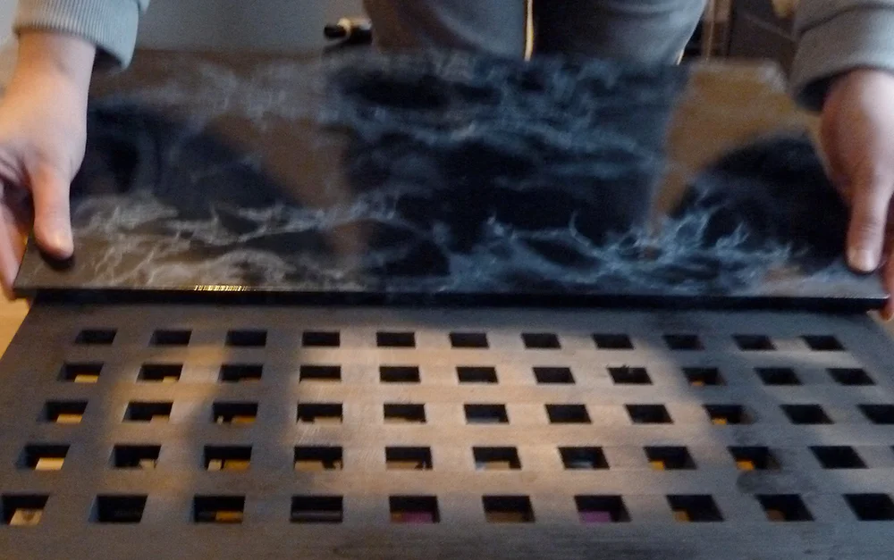 Passons désormais à la phase assemblage. Commencez par encoller un demi plateau en suivant les croisillons de la table. Alignez le premier plateau marbre sur la ligne centrale pour que la table puisse toujours être ouverte et repliée. Recommencez l'opération avec le deuxième plateau marbre. Laissez sécher.